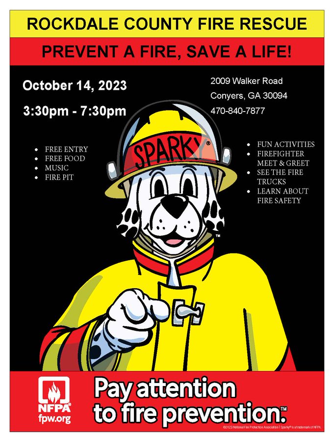 From our community partner Rockdale County Fire Rescue: Fire Prevention Week event, October 14, 2023, 3:30-7:30 p.m. at Rockdale County Fire Station Number 9, 2009 Walker Road, Conyers, GA 30094. Free entry, food, music, activities, fire trucks, firefighter meet and greet.