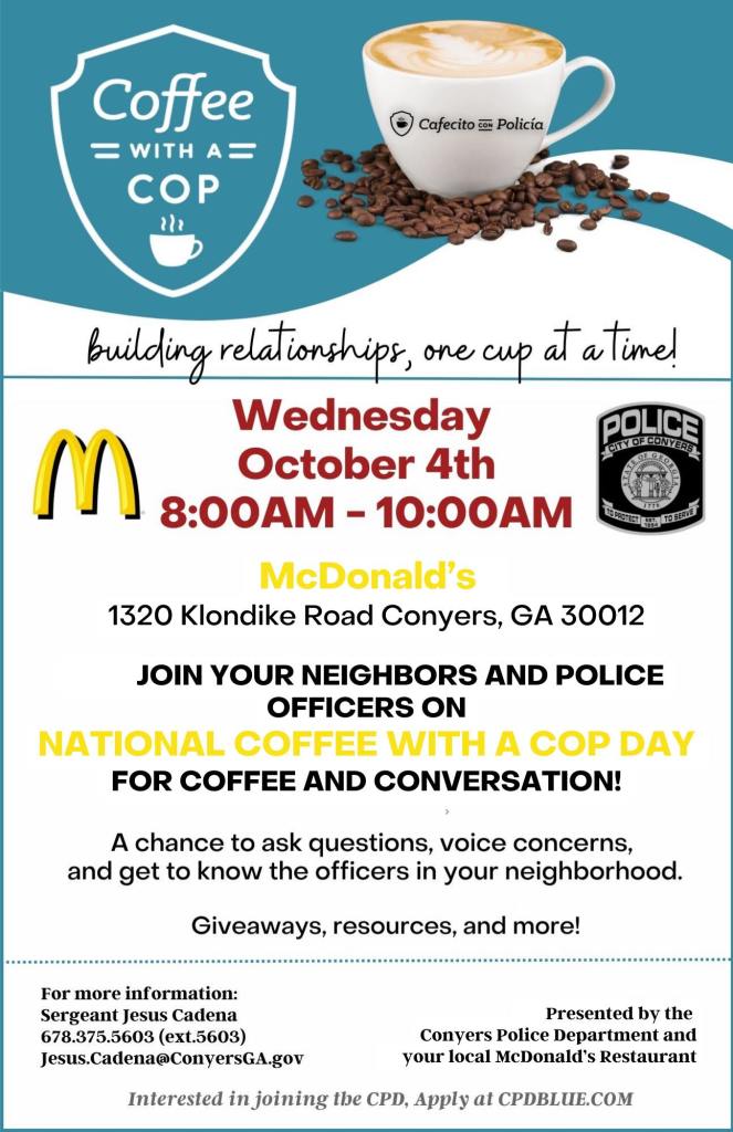 is tomorrow, Wednesday, October 4, at the West Avenue McDonald’s from 8-10 a.m. Stop by to ask questions, voice concerns and get to know Conyers Police Department officers.